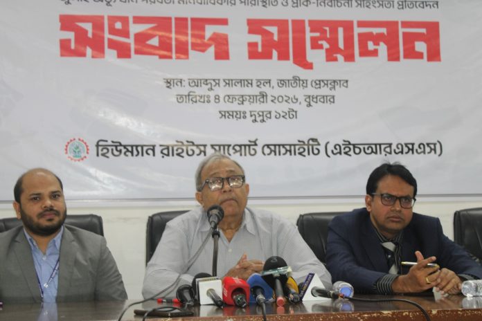 জাতীয় প্রেস ক্লাবের আবদুস সালাম হলে আয়োজিত সংবাদ সম্মেলনে ‘জুলাই অভ্যুত্থান-পরবর্তী মানবাধিকার পরিস্থিতি ও প্রাক্-নির্বাচনী সহিংসতা’ শীর্ষক প্রতিবেদনে এসব তথ্য তুলে ধরা হয়। প্রতিবেদনটি উপস্থাপন করেন এইচআরএসএসের নির্বাহী পরিচালক ইজাজুল ইসলাম।